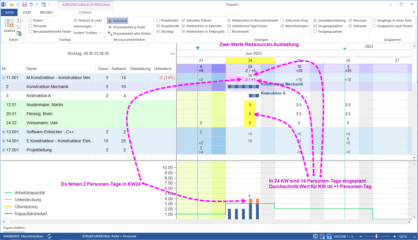 Начиная с Rillsoft Project 9, возможно, представлены два значения загрузки ресурсов под потребностью в ресурсах, а именно максимальная нехватка ресурсов и среднее покрытие ресурсов за единицу времени. Таким образом, в указанном выше примере можно увидеть значение потребности в ресурсах -2/+1 человеко-день на неделю.